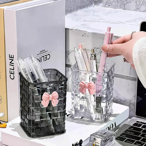 Desktop Pen Holder And Storage Box, Featuring A Bow Decoration And Storage Basket, Suitable For Storing Office Supplies